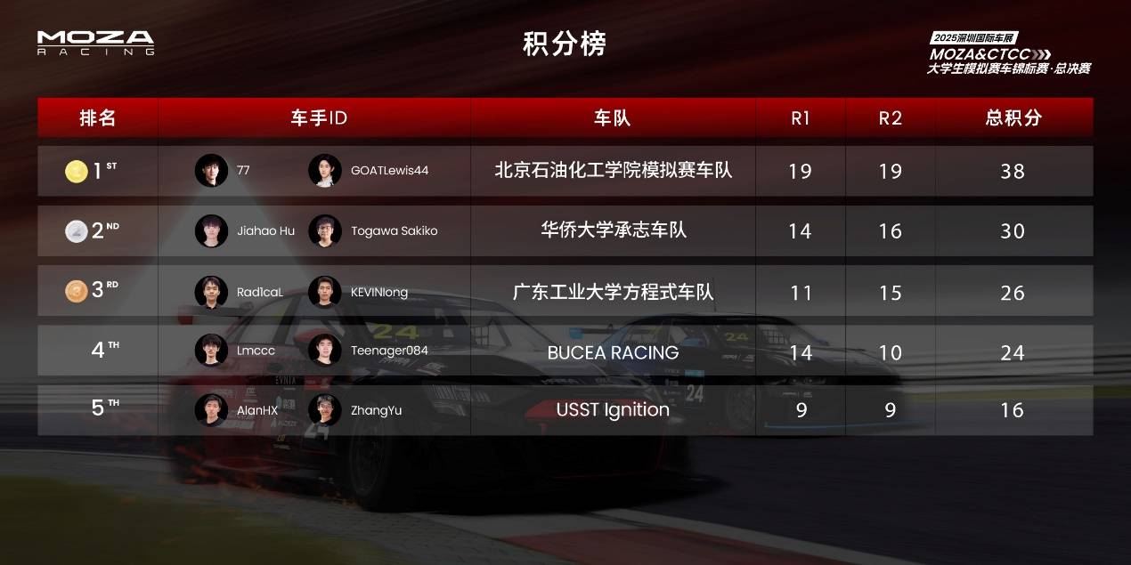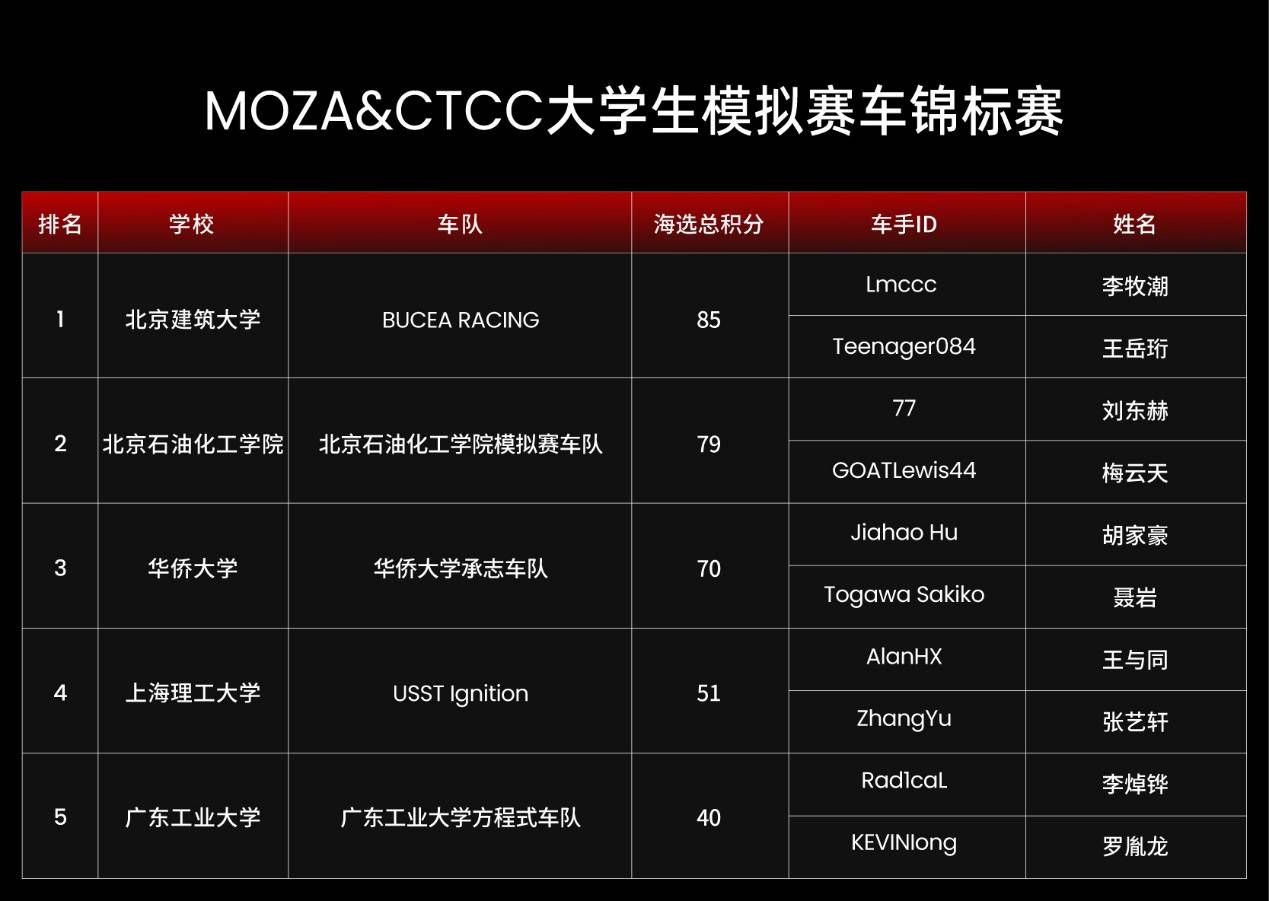 本届大赛历时6个月、历经4轮海选及积分赛的激烈角逐,“MOZA&CTCC大学生模拟赛车锦标赛”共吸引全国76所高校的87支大学生车队参赛,最终北京建筑大学、北京石油化工学院、华侨大学、上海理工大学、广东工业大学共5支车队晋级深圳总决赛。“MOZA模拟赛车全国城市联赛”吸引全国24座城市的59支车队参赛,最终来自北京、宁波、上海、成都、南京的5支城市车队晋级深圳总决赛。
