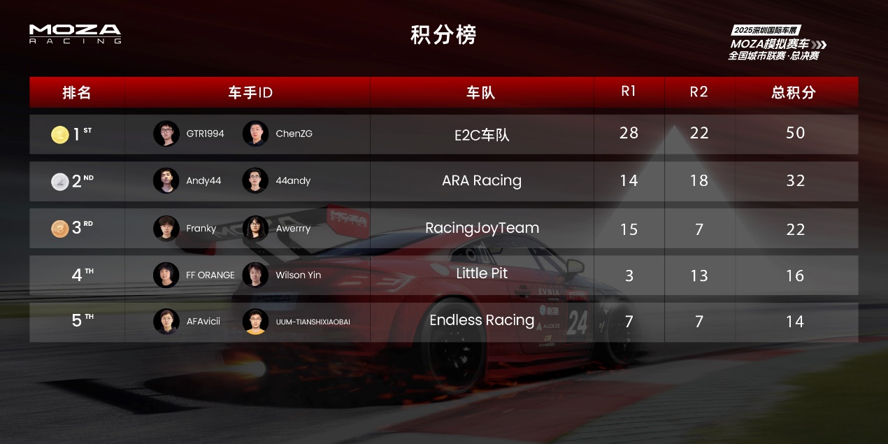 下午3点,“MOZA模拟赛车全国城市联赛”正式开赛,本场总决赛选用SPA赛道。在排位赛中,来自RacingJoyTeam车队的李昊谚,以02:28.992圈速夺得杆位。在首轮正赛中,各城市车队展现了成熟的赛道攻防策略及队内配合,城市车手们激烈对抗,精彩演绎赛道极限追赶。北京E2C车队的尹正和陈嘉琪凭借队友间的超强默契与绝妙配合,分别获得首轮正赛第一第二,李昊谚排名第三。在第二轮正赛中,尹正凭借教科书级别的高超技巧,在最后一圈成功反超一直处于领跑位置的范辰霄,绝地逆转拿下第一,范辰霄、陈泽宇分居第二、第三。