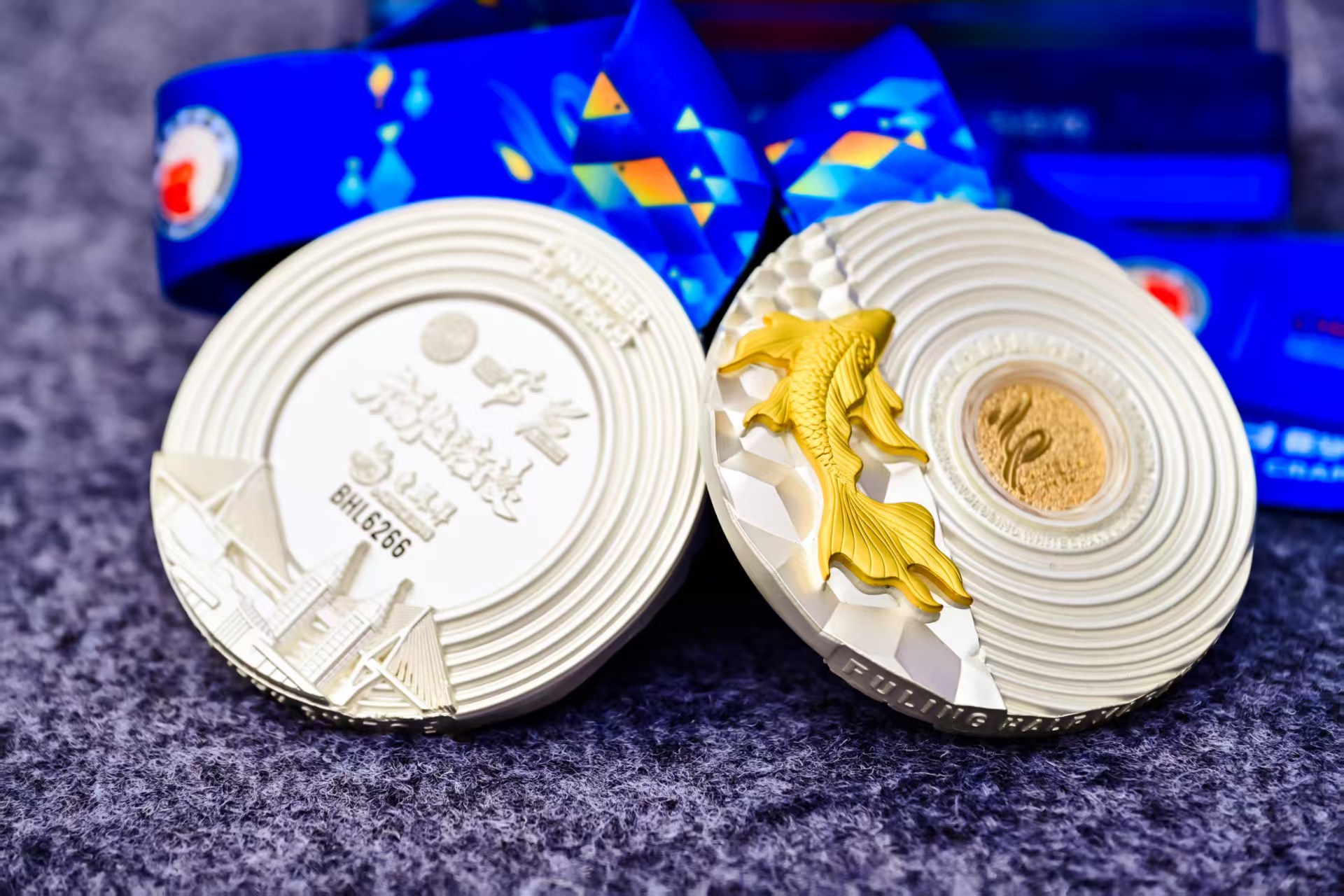 本届赛事半马规模首次扩容至8000人,同时升级成为中国田协A1类赛事认证,从赛事流程、裁判标准到安全保障均按高规格搭建,让全国跑友感受专业赛事的严谨与规范。全新设计的镶金奖牌及参/完赛装备,也让跑友们连连点赞!本届涪陵半马,延续了此前奖牌镶金的传统,奖牌中间的那一抹“金”,大大提升了整块奖牌的“含金量”,奖牌正面一尾灵动的涪鱼正破水游动,暗合“年年有余”的美好寓意,精准还原了白鹤梁水下石缝间鱼群游弋的生机图景。“特意从北京过来参赛,没想到涪陵半马有这么丰富专业的参赛体验!这样的规模和规格,未来绝对会成为跑圈追求成绩‘必打卡’赛事!”半程选手赵先生说。