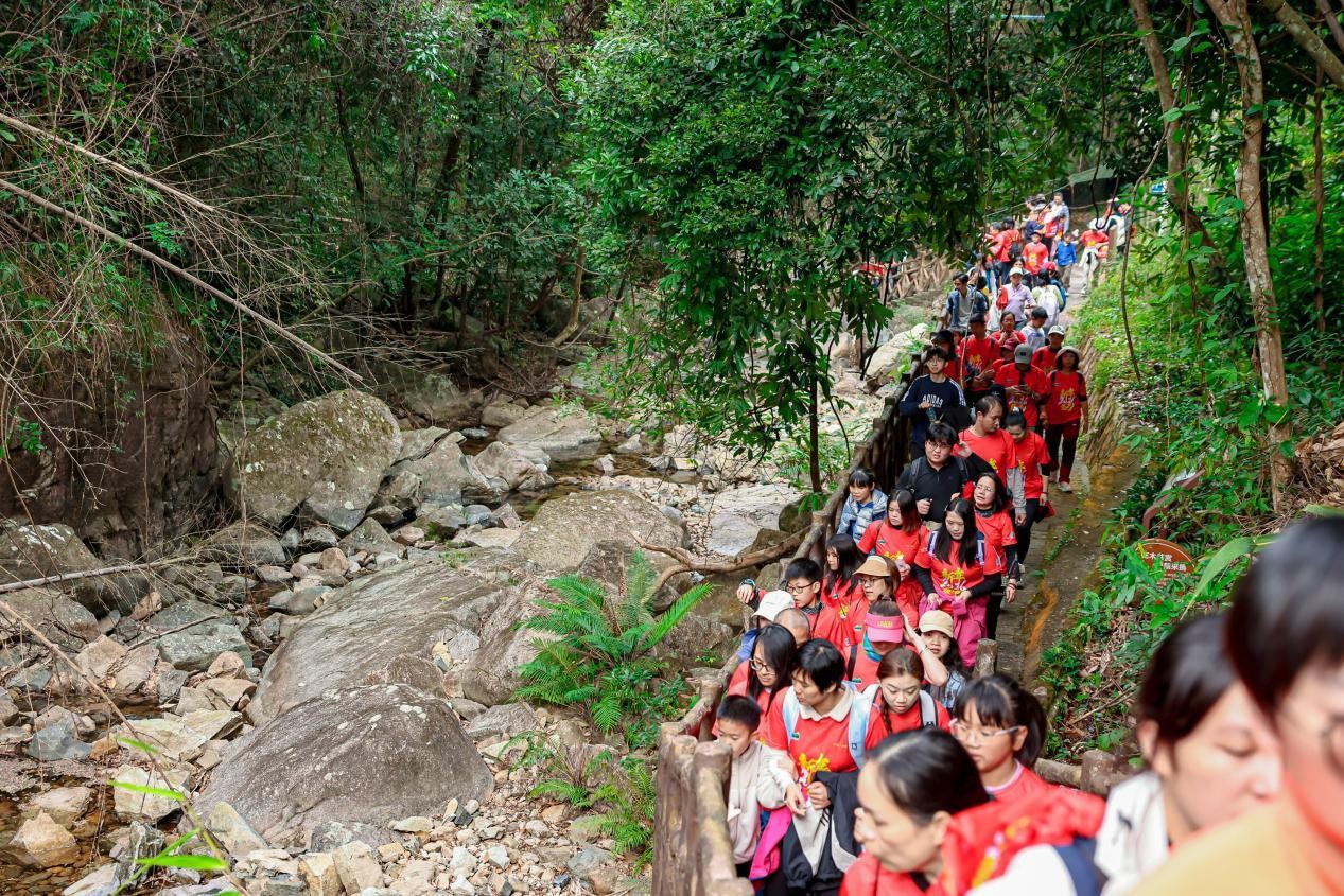 本次活动选址生态禀赋优越的流溪河国家森林公园五指山景区,精心规划两条特色登高路线,精准适配不同群体需求:挑战组全程15.5公里,累计爬升1020米,以五指山景区主会场为起点,沿途串联清音桥、三桠塘幽谷、登山栈道、月牙湖等核心景观节点,最终抵达流溪河水库观景长廊,线路串联起山林秘境、溪流峡谷与湖光盛景,为专业登山爱好者打造兼具耐力考验与风光观赏的进阶赛道,登顶远眺可将流溪河水库星罗棋布的湖岛风光尽收眼底;休闲组全程9公里,选取坡度平缓的环湖步道与竹海小径,途经青年山庄、鹿湖田茶园等景观,终点同样设于流溪河水库观景长廊,让亲子家庭、健身新手能轻松漫步山间。两条路线均穿梭于森林覆盖率超95%的“天然氧吧”之中,沿途绿树成荫、溪流潺潺、竹海连绵,参与者在攀登过程中既能感受运动的酣畅,又能沉浸式领略五指山“奇峰耸立、沟壑纵横”的生态之美,其中休闲组的三桠塘幽谷溯溪路段,更成为众多家庭亲子互动的热门选择。