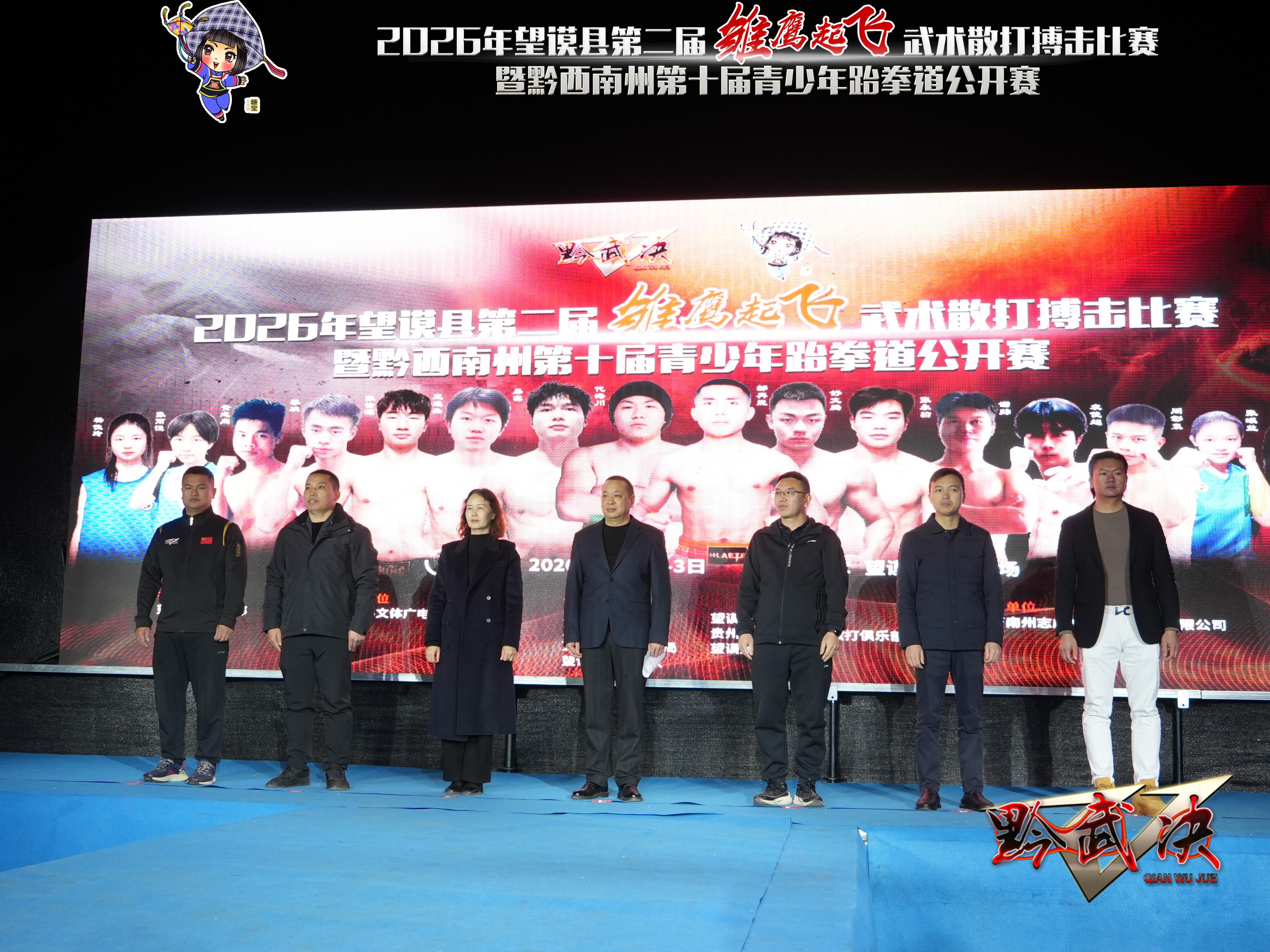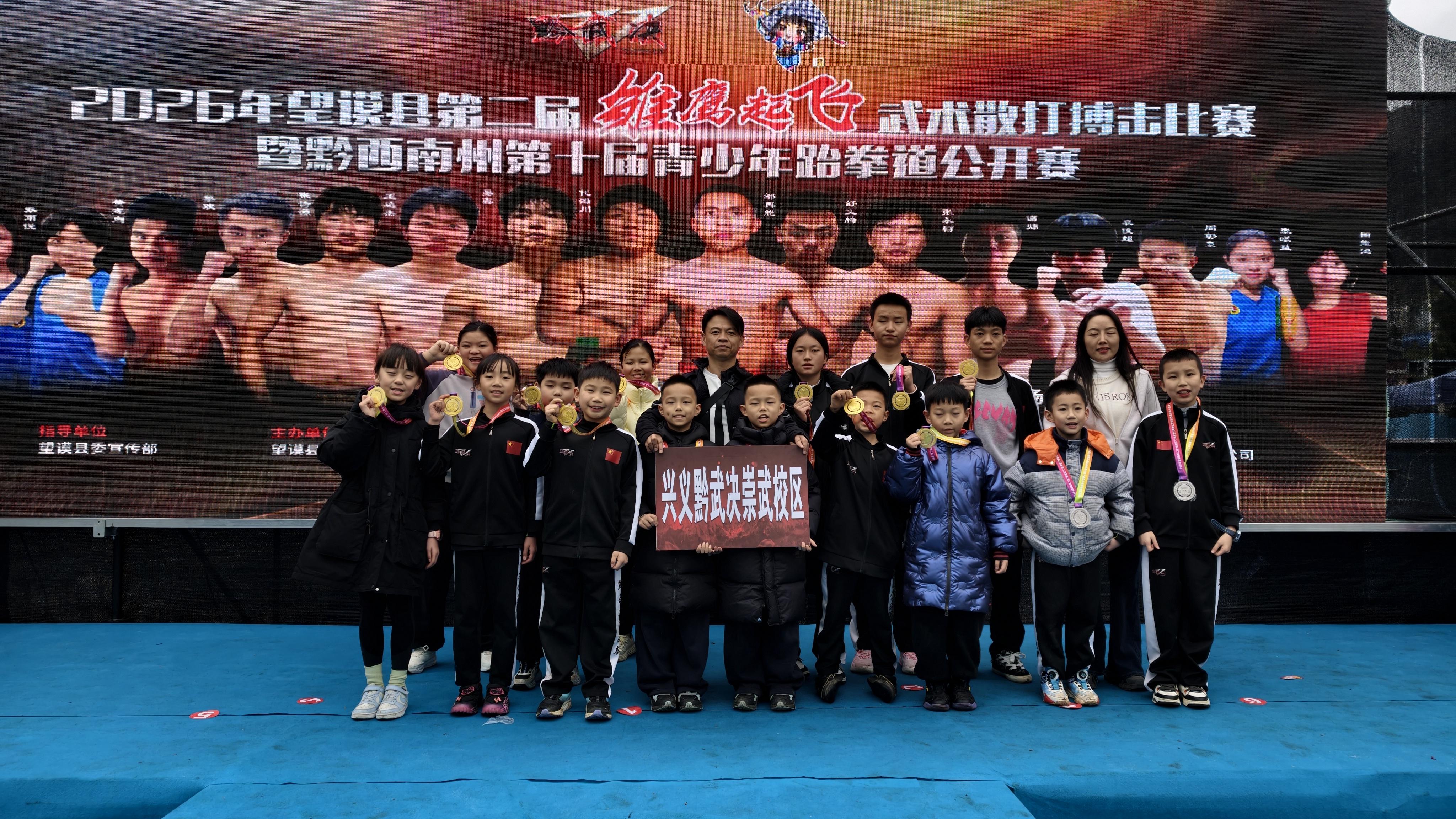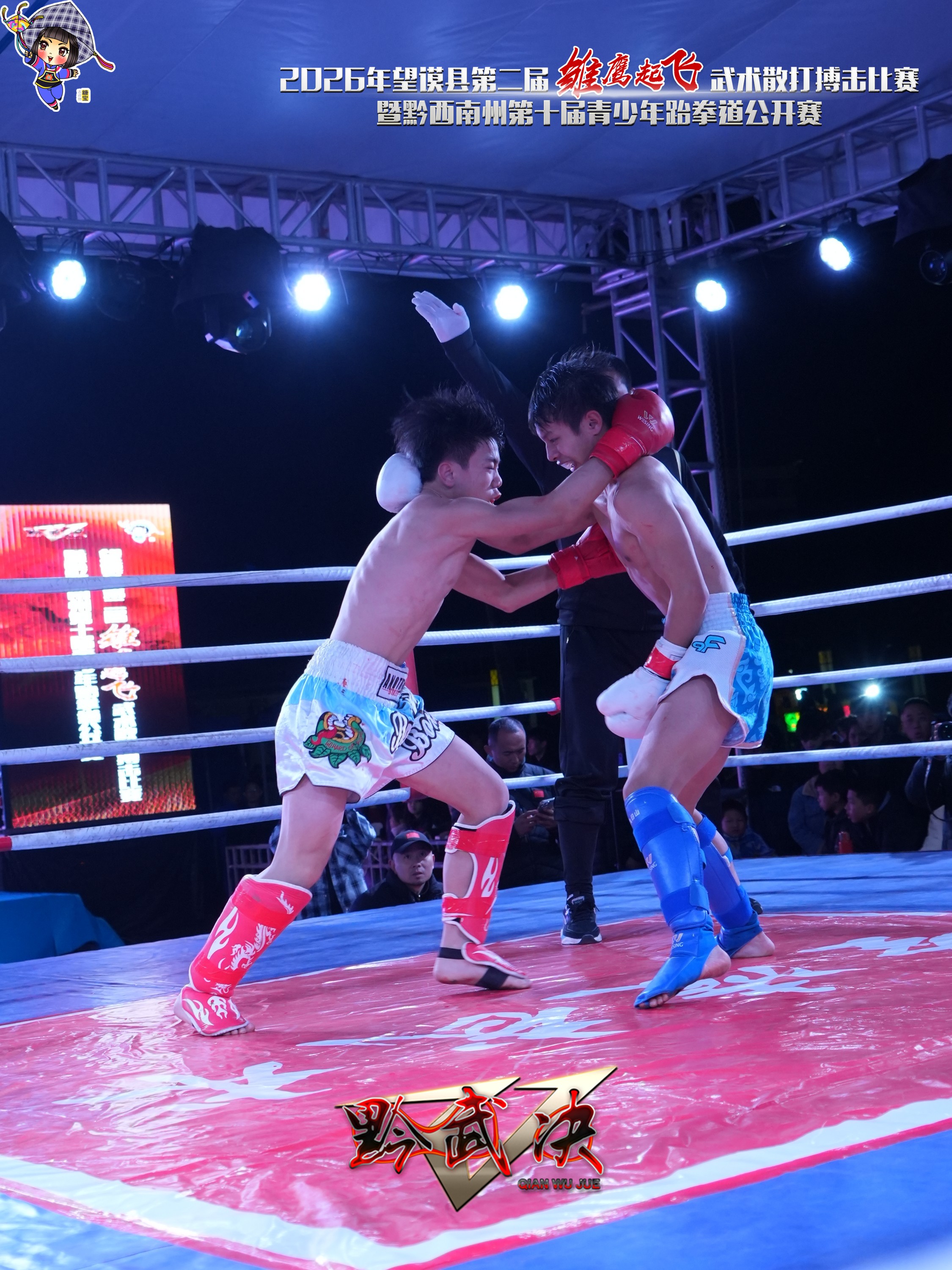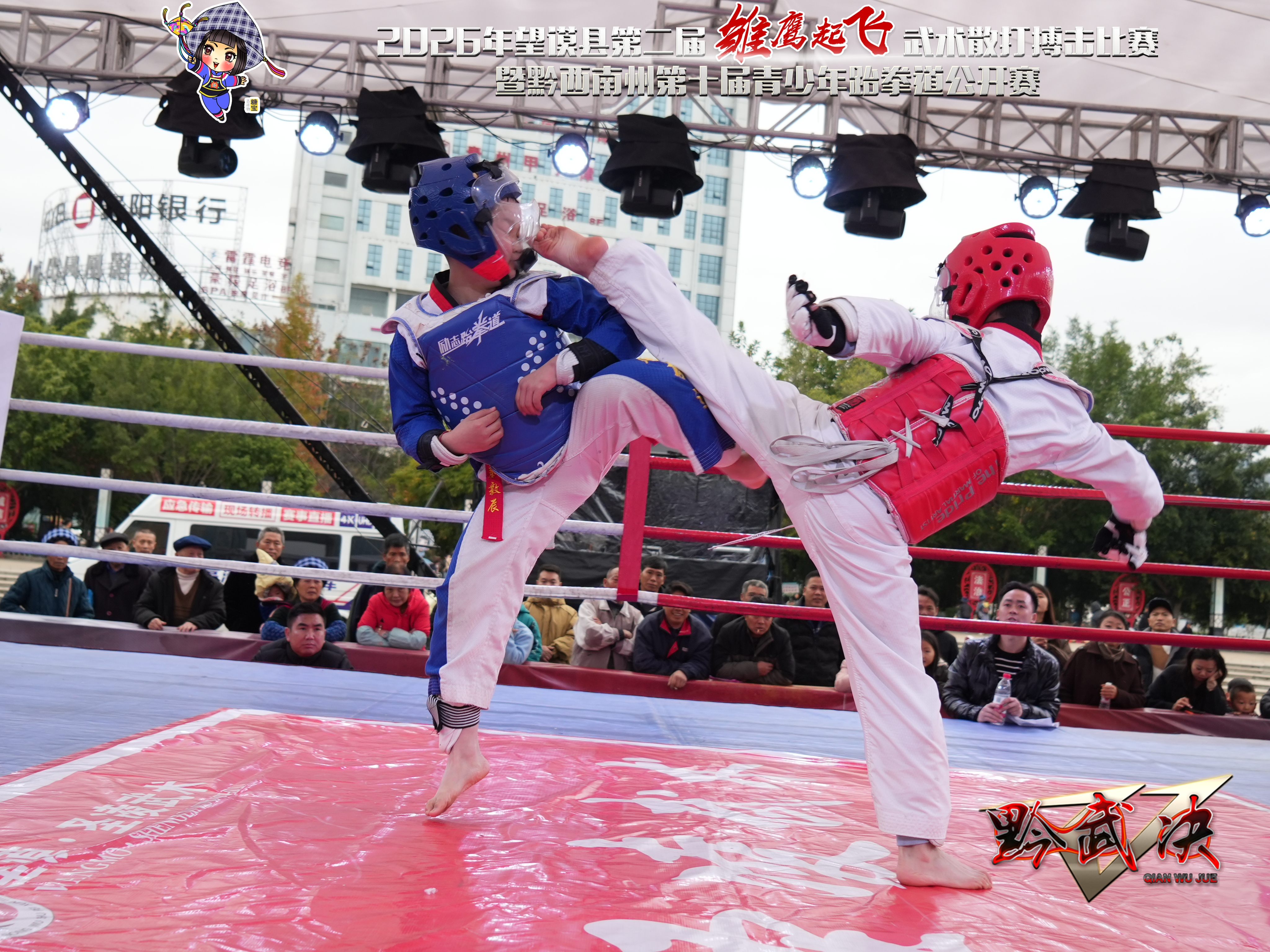 为进一步弘扬中华武术,深入推进体教融合发展,搭建高水平竞技交流平台,选拔优秀体育后备人才,2026年1月1日至3日,望谟县第二届“雏鹰起飞”武术散打搏击赛暨黔西南州第十届青少年跆拳道公开赛在望谟县王母广场火热开赛。