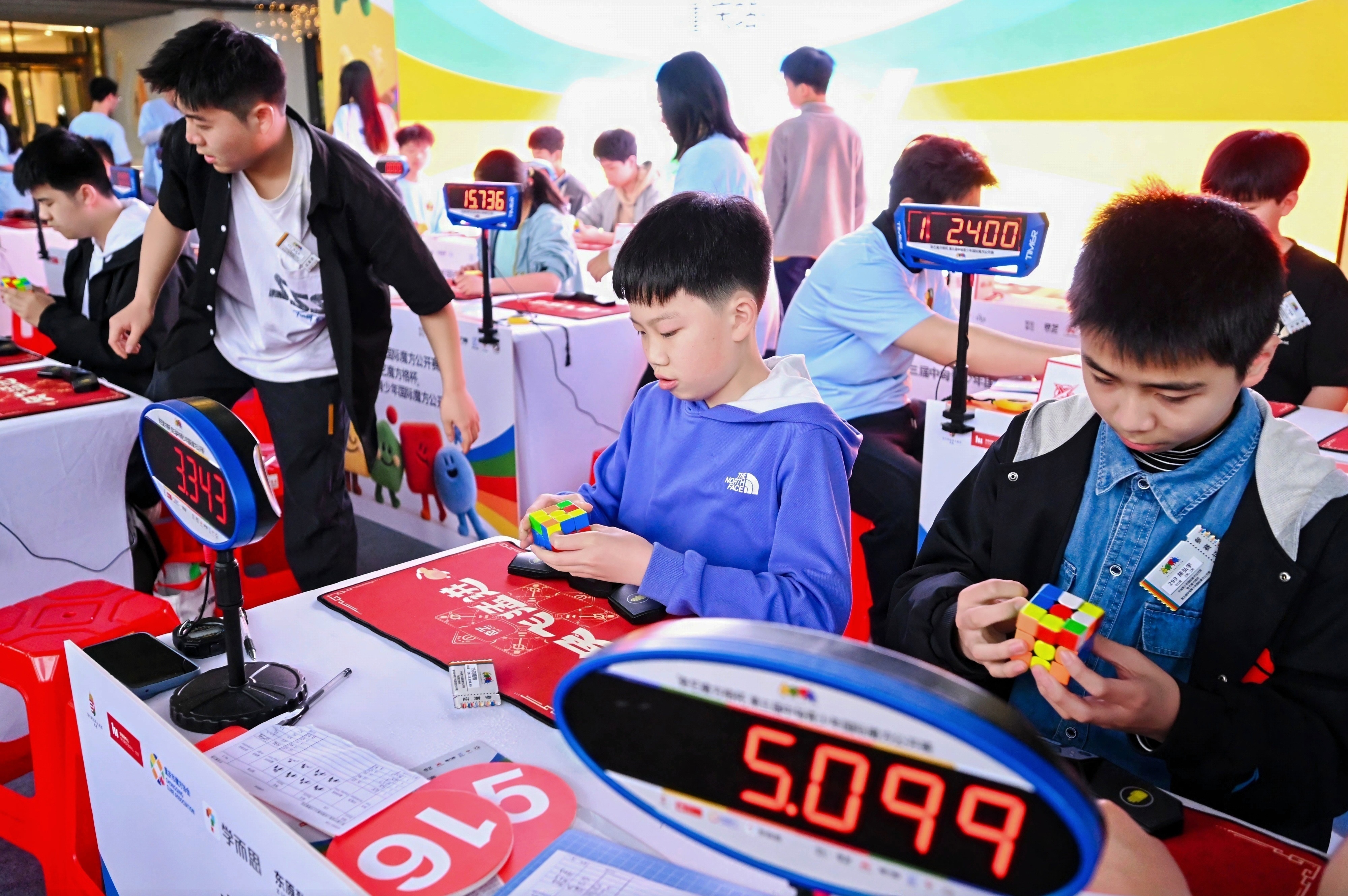 下午开展二阶、三阶主流项目竞赛,累计参与超600人次。赛场内选手专注竞技,魔方高速旋转,展现出扎实的技术功底与良好的竞技风貌。宏帆八中O12组选手刘桓锦以单次5.05 秒、平均6.33秒夺得三阶项目最佳;北碚区中山路小学 U10 组选手马祥予、沙坪坝区第一实验小学U10组选手李向珊分别以平均2.33秒、单次1.71秒的成绩,创下二阶项目最佳纪录。