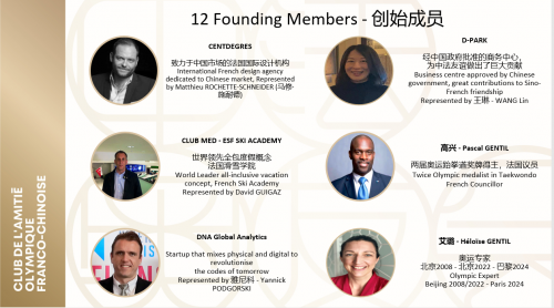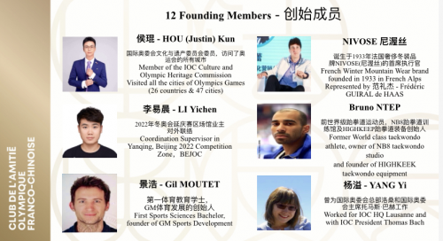 【中法奥友会】 作为第一个由中法奥运核心人士组成以弘扬奥林匹克精神为主的非政府组织,在成立初期便吸纳了法国企业代表-法国奢侈冬装品牌NIVOSE (尼渥丝)首席执行官,费雷德里克·吉拉尔·德哈斯(Frederic GUIRAL de HAAS), 法国两届奥运跆拳道铜牌获得者及法国议员帕斯卡·让蒂尔(Pascal GENTIL),国际奥委会文化与遗产委员会委员及奥林匹克环球行发起者-侯琨等12个中法奥运人的加入。