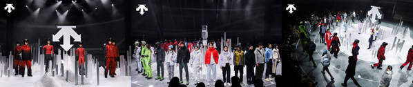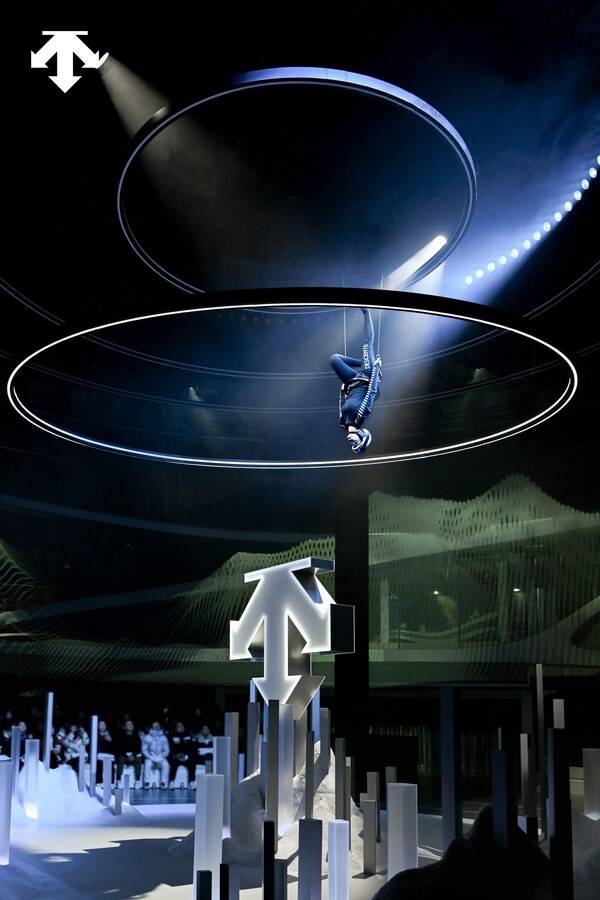随着光影点亮象征未来的时空之门,"未来使者"身着未来感装备自高空滑入秀场,将"未来之城"转化为立体的冰雪场域。随着他的落点,环幕之上山峰与雪线被逐一唤醒,仿佛一座真实雪场被带入现场。这一幕呼应着迪桑特"一切始于滑雪"的品牌基因——滑雪运动的专业内核早已深植品牌之中,而这场空中演绎,正是对这份初心的当代诠释,更以动感姿态串联起冰雪文化、科技表达与品牌精神,构建起品牌从专业根基迈向未来运动文明的完整视觉语言。