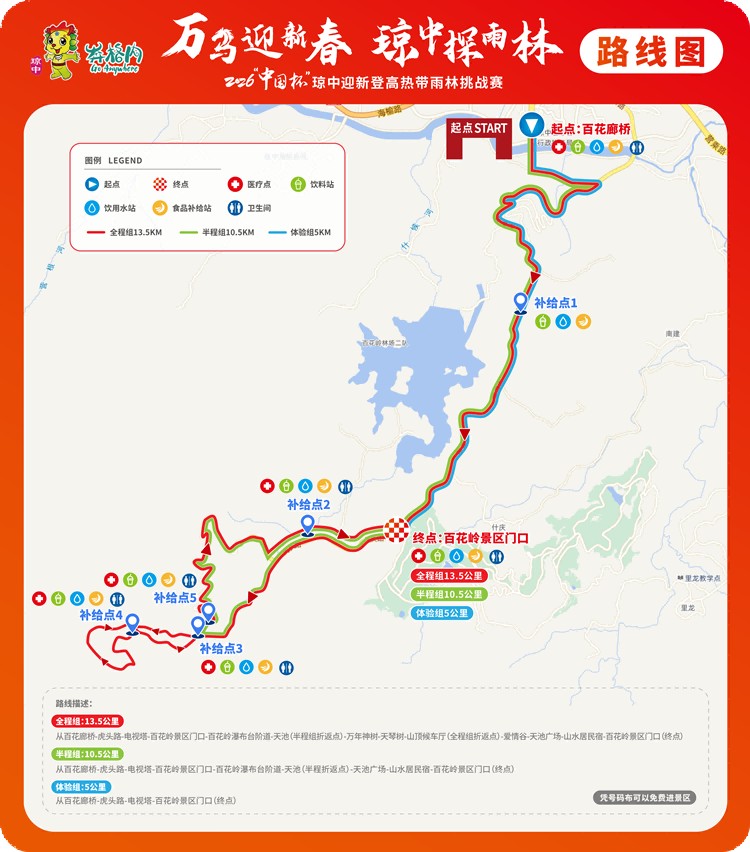赛事精心设置三条赛道满足不同需求:13.5公里全程组面向专业户外达人,登顶雨林核心秘境,挑战高海拔爬升与多元路况,冲刺丰厚奖金;10.5公里半程组串联瀑布、天池等核心景点,平衡挑战感与观赏性,适配进阶户外爱好者;5公里体验组主打休闲漫步,适合亲子家庭与休闲游客,轻松打卡雨林浅区景致。全程赛道均设置充足补给点,提供能量食品与饮用水,终点更设有免费摆渡车接送选手返回起点,全方位保障参赛体验。