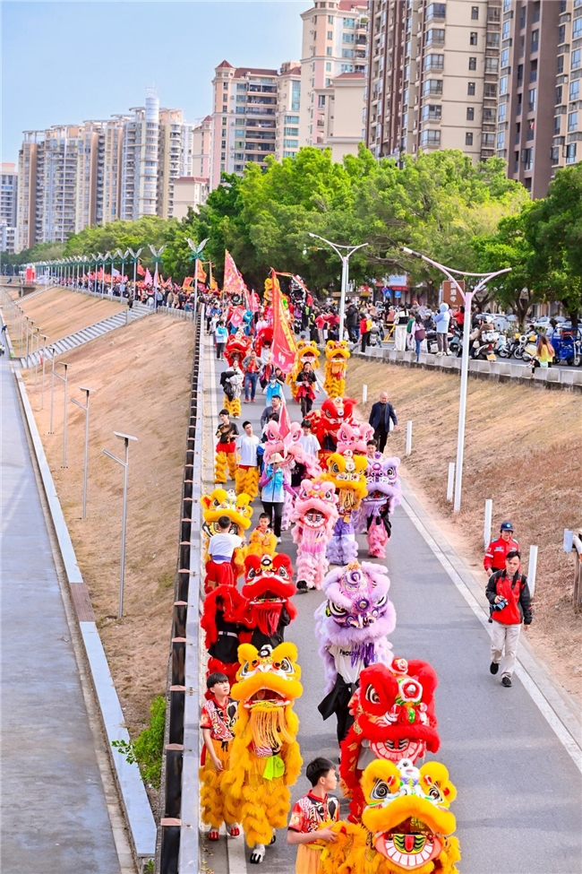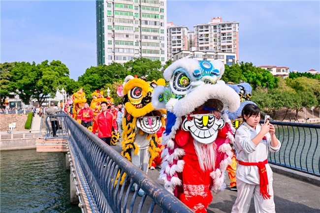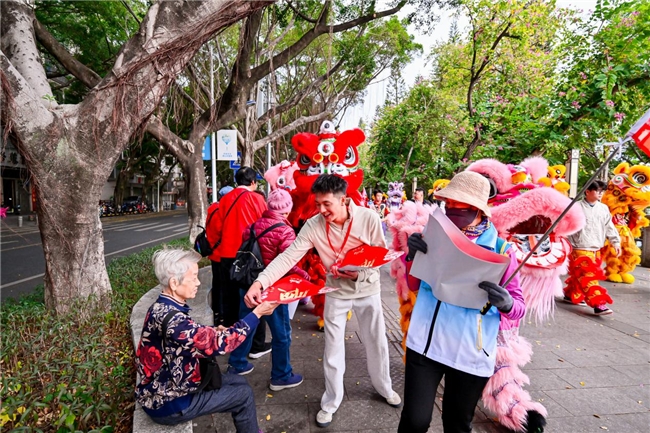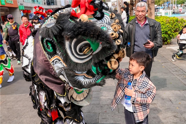 全程约4公里的路线串联起金瓯广场、欣荣广场、远达广场、莱茵汇大广场等城市核心地标,沿途狮队、祥龙、骏马队伍将向市民游客赠送新春福字,现场市民群众热情高涨、反响热烈。不少家庭扶老携幼驻足观看,纷纷举起手机、相机记录这一盛景,孩子们围着祥龙、骏马欢呼雀跃,主动上前摸狮头、狮尾讨彩头,接过福字时满脸欢喜;年长市民一边欣赏巡游,一边交流狮艺文化。
