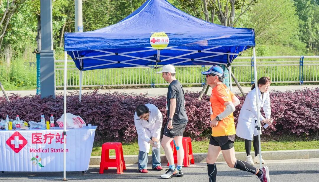 比赛期间,共设置了22个医疗站点、8辆救护车、37台移动AED,并配备了专业医护人员及赛道医疗观察志愿者,为参赛选手构建了严密的“生命守护线”;公安交警周密部署,筑牢赛事安全防线。